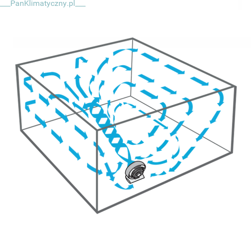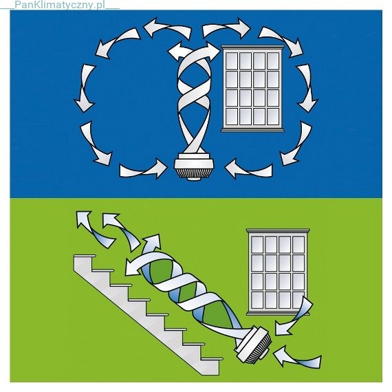 Urządzenie będąc w pozycji poziomej wytwarza komfortowy ruch powietrza opływający pomieszczenie, ponadto użytkownik ma możliwość skierowania strumienia powietrza bezpośrednio na siebie. Po skierowaniu głowicy pionowo, uzyskamy w pomieszczeniu efektywne wyrównanie temperatury powietrza, dzięki wymieszaniu chłodniejszego powietrza przy podłodze z cieplejszym pod sufitem.
