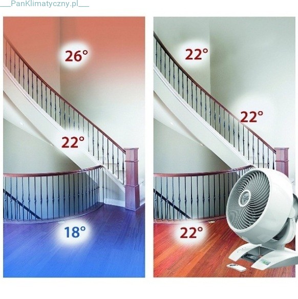 Stosując wentylator Vornado Energy Smart możliwe jest zmniejszenie kosztów ogrzewania i chłodzenia pomieszczeń. Podczas używania cyrkulatora wraz z klimatyzacją lub z innymi źródłami ciepła, zachodzi sposobność przeniesienia części powietrza do sąsiedniego pomieszczenia, a także efektywnego rozprowadzenia powietrza na całej przestrzeni (Uwaga! Nie należy stawiać wentylatora bezpośrednio przy źródle ciepła).