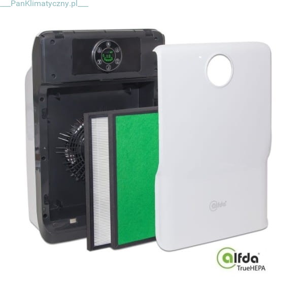 oraz filtra HEPA z węglem aktywnym odpowiadającego za ograniczanie zanieczyszczeń powietrza takich jak: niebezpieczne dla zdrowia składniki pyły PM 2,5 i PM10, dym tytoniowy, roztocza i alergeny, rozpuszczalniki, aldehydy, chemikalia, formaldehydy (szkodliwe substancje zapachowe), kwas octowy, zarodniki grzybów, cząstki stałe, pływające, kurz domowy, dym z kominów i sadze, dym z samochodów, bakterie i sierść. Jego skuteczność wynosi 99,5% przy zanieczyszczeniach 0,1 mikrona. - alfda TrueHEPA - Filtr zbudowany z: filtra wstępnego (j.w),